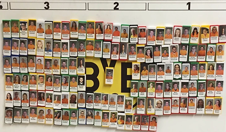 У двери – магнитная доска со схемой стадиона по секторам и минипортретами каждого из волентеров. Сейчас все в центре. Потом для наглядности их могут передвинуть в закрепленные за ними зоны. Также есть распределение по цвету – зеленый, желтый, красный, белый, оранжевый – в зависимости от деятельности (четкость фото понижена умышленно):