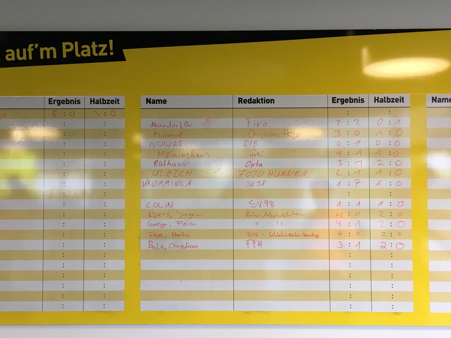 Чтобы попасть в пресс-центр, надо воспользоваться лифтом. Среднестатистисческую игру «Боруссии» отрабатывают 50 журналистов. Многие из них перед матчем оставляют прогнозы. Один парень, близкий к «Дармштадту», предсказал счет 7:1 в пользу гостей. Что ж, разницу он действительно угадал (извиняюсь за блики света):