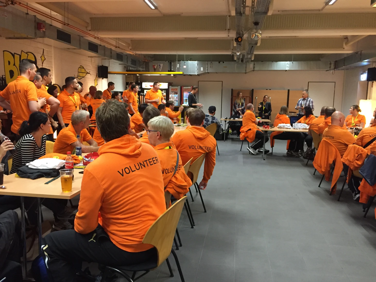 Первая остановка – удобно расположенная, но скрытая от болельщиков комната волонтеров. Большинство не знает о ее существовании. Это просторное помещение со столами у стен, баром и ширмой для переодевания в фирменную оранжевую толстовку. За три часа до матча тут уже хватает народа. Кто-то потягивает «Колу» или минералку, кто-то – пропускает бокал пива под обсуждение последних новостей. На висящих по обе стороны телевизорах крутят повторы вчерашних матчей.