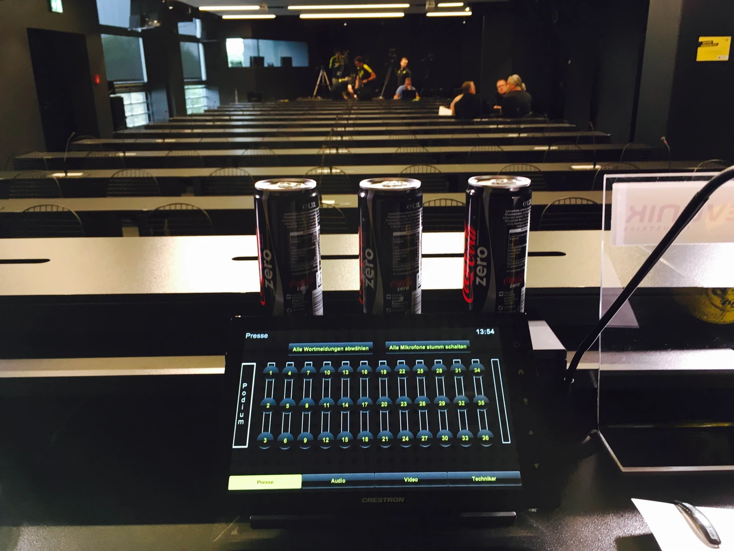 А вот конференц-зал. Когда кто-то хочет задать вопрос, он нажимает кнопку, тем самым посылая сигнал на экран модератору. Тот может как увеличить звук микрофона, так и полностью заглушить его: