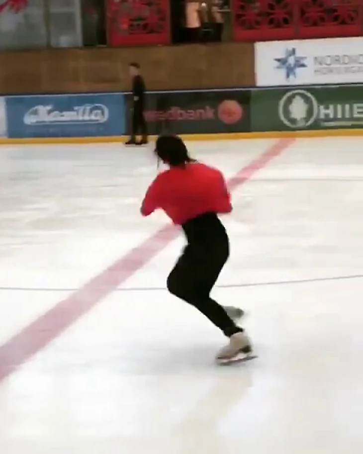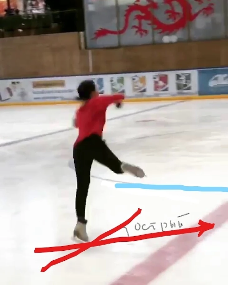Момент приземления. Она приземляется гораздо ближе к центральному кругу. Чтобы у нее не было недокрута требуется, чтобы линия полета была перпендикулярна красной линии, но это не так. В случае идеального прыжка Туктамышева сразу поехала бы на заднем внешнем ребре по дуге на оператора и вправо.