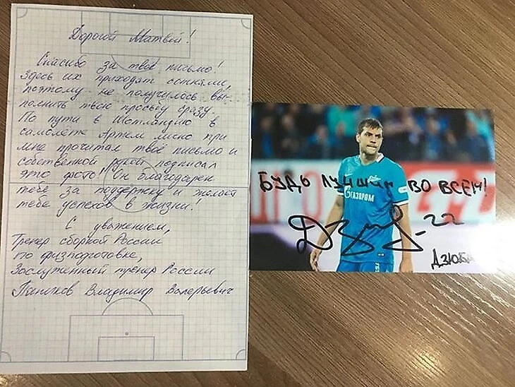 Плавно к беседе подключается Матвей: «Первое письмо написал в мае 2019 года, но идея пришла задолго до этого. На уроке английского языка у нас было занятие про автографы. Учительница рассказала историю, как ее знакомая получила автограф какого-то знаменитого актера. Вот тогда я загорелся и решил написать Дзюбе.