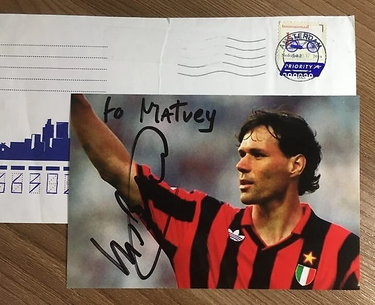 – Он легенда, обладатель трех «Золотых мячей». Точно так же зашел к нему на сайт, нашел адрес и отправил фото с письмом на нидерландском языке, а в ответ мне пришло два письма от Ван Бастена: мое и еще одно подписанное.
