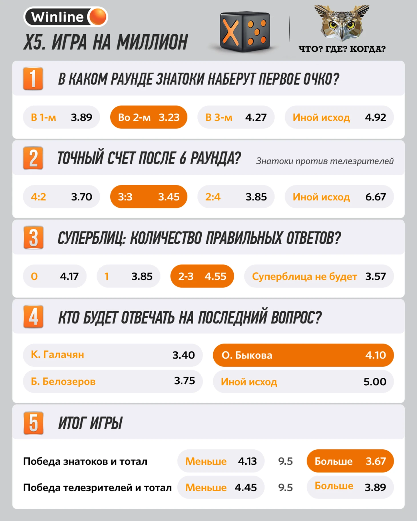 Вы в блоге «X5 – игра на миллион», который мы ведем вместе с букмекерской компанией Winline. В этом году Winline стал спонсором игры «Что? Где? Когда?». Теперь в приложении Winline вы можете сделать (бесплатно!) прогноз на ЧГК и если угадаете все пять исходов, которые случатся в выпуске, получите миллион рублей!