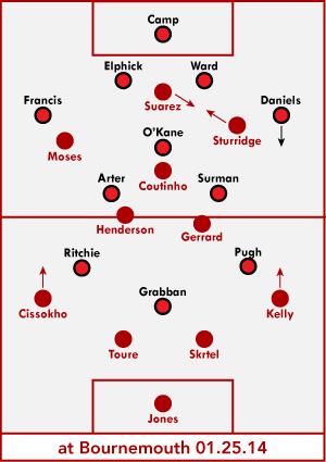 В кубковом матче с Борнмутом, состоявшемся за неделю до окончания трансферного окна, в котором команда боролась за крайних полузащитников, была презентована расстановка, при которой на вакантном месте правого полузащтитника ротировались Луис и Дэн. Все это проходило на фланге несчастного Келли, по которому в первом тайме прошло множество опасных атак соперника, хотя форварды и не отлынивали от игры на своей половине поля. "В первом тайме что-то пошло не так", - позже скажет Роджерс в интервью Каррагеру.