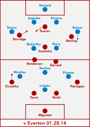 В следующем матче АПЛ - дерби на Энфилде - ротация Суареса и Старриджа на позиции полузащитника была перенесена на левый край, к Сиссоко. По большей части на острие играл Луис, но и Дэн забил оба своих гола в одну из своих смен впереди. Полное впечатление о том, как этот вариант расстановки показал бы себя под давлением забравшего мяч Эвертона, не удалось составить из-за ранней замены Старриджа.