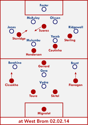 В последней к настоящему моменту встрече лиги с Вест Бромом Луис и Дэн снова ротировались, хотя и по более сложной схеме, чем приложенная ниже. В обороне на левом крае полузащиты Ливерпуля отрабатывал Хендо, а Суарес и Старридж занимали место в центре.