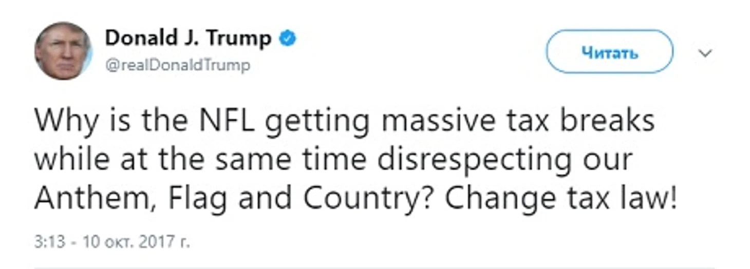 Дональд Трамп: «НФЛ не уважает наши гимн, флаг и страну – нужно лишить лигу налоговых льгот»