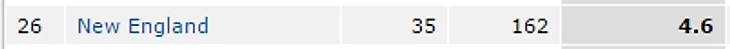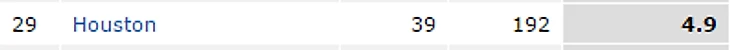 аж 27 по пропущенным ярдам в среднем за попытку, аж 8.0, и при этом у них очень высокий процент комплитов соперника, аж 68.3 что прям подарок для принимающих Хьюстона, как видим Райан и Батлер не такие уж и хорошие ребята, хоть эта статистика касается не только их. Стоит ли ожидать много пасовой игры от Хьюстона при такой статистике Патриотов? думаю конечно же да, Освайлер несмотря на перехваты как то не спешит уменьшать рисковые дальние передачи и агресивную игру на своих принимающих.