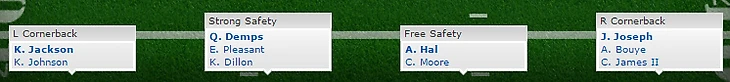 Джексон и Джозеф весьма добротные корнеры, как и Джонсон который под вопросом, а если и сыграет то это будет очень на руку Хьюстону, дело в том что он играл с Бриссеттом в одной команде и знает его как облупленного. Поэтому мне тяжело предположить как отыграют корнеры против ресиверов Пэтс, потому что последние ловят 70% комплитов по сезону, в тоже время защита от паса у Тексанс на высоте,