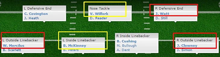 Это схема защиты Хьюстона, играют они по 3-4, а теперь поясню что значит красный и желтые цвета, Краный это элитные защитники, Уотт - Клауни - Мерсилус это сила, особо отмечу правый край который будет давить на левый фланг олайн Пэтриотс, здесь не выстоять никому. Желтый цвет это менее крутые игроки, но все так же очень опасны. Сюда бы я отнес и Кушинга, но к сожалению травма. Вот такая братия и будет давить на Бриссетта. Вы думаете новичку дадут время подумать? я думаю нет, и теперь плавно перейдем к новому квотербеку Пэтс.