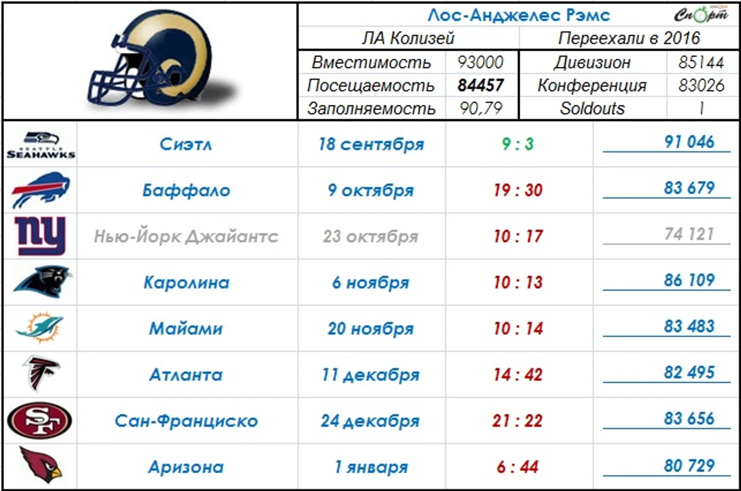 Да, вполне возможно, что так оно и есть. «Рэмс» (в переводе с английского – бараны) переехали в Лос-Анджелес в прошлом году из Сент-Луиса. Стэн Кронке, владеющий не только этим клубом НФЛ, но и рядом других, например, лондонским «Арсеналом», был уверен, что город соскучился по профессиональному футболу. Тем более что «Рэмс» возвращаются на историческую родину, откуда они вынужденно сбежали в 1994 году – как раз из-за необычайно низкой посещаемости. Никто не сомневался в том, что клуб станет успешным, а НФЛ сделала огромные шаги вперед по сравнению с собой образца двадцатилетней давности. После переезда стоимость клуба возросла почти в три раза, и сейчас «Рэмс», по данным Forbes, стоят около 3 млрд долларов.