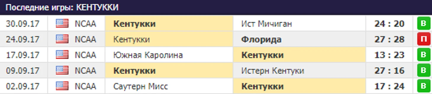 В студентах имеются множества крутых атак, но никого из них вы не увидите чемпионом, в финале опять всех будет иметь защитная Алабама) или Пенн Стейт, да и Клемсон с Джорджией там же) Все эти команды умеют набирать очки, но в этих командах нет лучших квотербеков и лучших в лиге принимающих. Потому что эти команды берут защитой и используют главное правило НСАА - защита приносит титулы). Поэтому в этой игре не защищающиеся совсем Миссури будут обыграны, Кентукки возьмет свое за счет отличной защиты, и для гостей все может обернуться кошмаром, потому что три последних встречи они провели ужасающе, но и команды там были у них в соперниках серьезные.