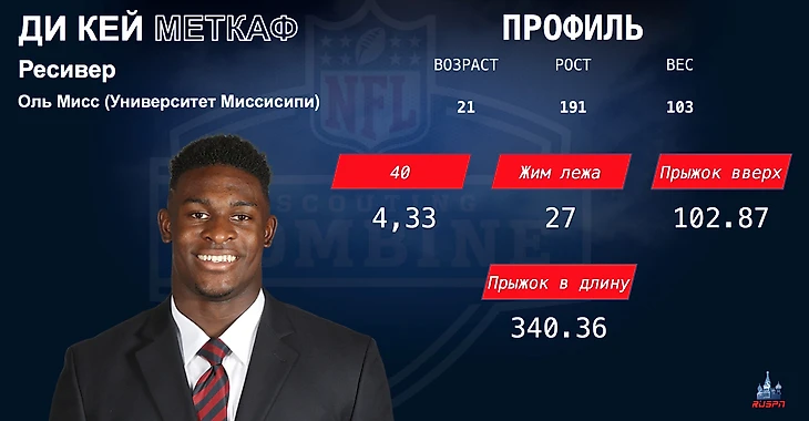 Меткаф – это ресивер с физикой супермена. Как подметил один комментатор под его видео с Комбайна: «у него габариты тайт-энда, скорость очень быстрого ресивера, сила верхней части тела сопоставима с силой, которая обычно у дифенсив-эндов и нижняя часть тела как у мощного раннинбэка». Он весит 103,4 кг, бегает не хуже многих спринтеров и доля жира в его теле составляет всего 1,8 процента! Для сравнения, у среднего спортсмена это доля находится в диапазоне от 6 до 13 процентов.