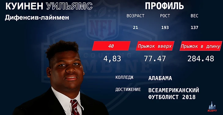 Куинен Уильямс, возможно, больше всего зарекомендовал себя в преддверии драфта, несмотря на то, что он тоже только два года отыграл в «Алабаме». Но он отыграл на один сезон больше (де факто), чем Мюррей или Хаскинс и у него нет травм в отличии от Босы. Также он играл в юго-восточной конференции («SEC»), которая ближе всего по уровню к НФЛ по сравнению с другими конференциями** и под руководством легендарного Ника Сейбана, чьи достижения можно сравнить с великим Сэром Алексом Фергюсоном.