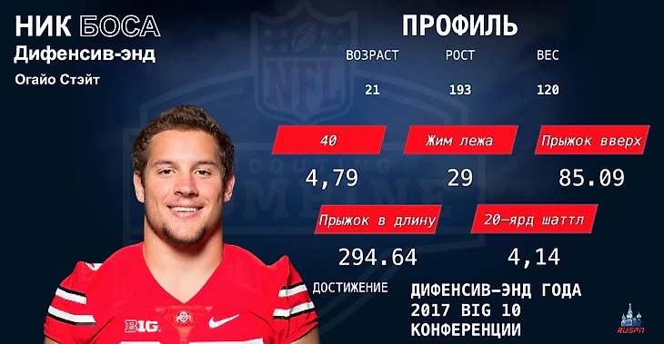 «Сан-Франциско Форти Найнерс»: ДЭ Ник Боса, «Огайо Стэйт» Если выбор «Аризона» действительно падет на Кайлера, то «Форти Найнерс» выберут лучшего игрока в драфте.