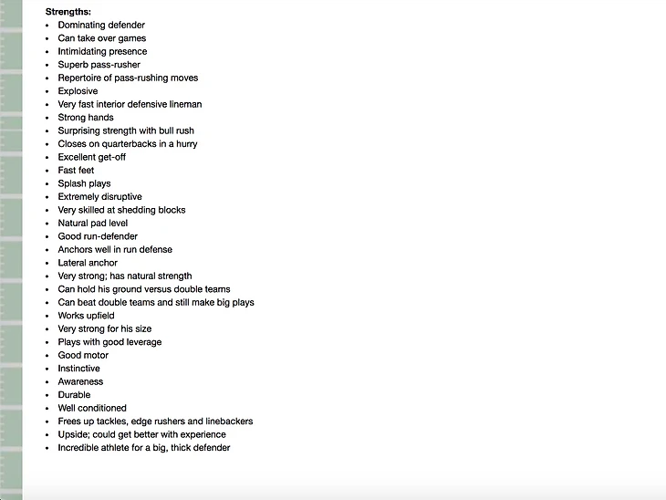 По мнению многих скаутов, всем. Он быстрый. У него хорошая техника: он отлично работает руками в «клинче» (так легче всего объяснить борьбу игроков защиты, которые пытаются прорваться к квотербэку, и лайнменов чья работа предотвратить это) и он выбирает стойки, которые делают его крайне уязвимым. Есть даже мнение, что он может превзойти своего брата.