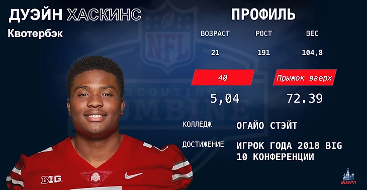 Ответ простой – многим. Хаскинс именно тот квотербэк, который сейчас востребован в НФЛ. У него отличные габариты. Крупные квотербэки уже давно стали трендом в НФЛ и Хаскинс, при росте 191 см и весе 104,8 кг, полностью подходит под шаблон типичного квотербэка в НФЛ. Его статистика в прошлом сезоне была почти безупречной. Он поставил рекорд «Бакайс» и конференции «BIG 10» по количеству брошенных тачдаунов (50) и ярдов за сезон (4831). Он отлично понимает игру, чему свидетельство только 8 перехватов за сезон, при том, что он бросал мяч 533 раза. Из чего следует, что его INT% (процент пасов, которые перехвачены) 1,5%. Для сравнения только у 5 квотербэков в НФЛ этот показатель был 1,5% или ниже. И не менее важно, 70% его пасов были пойманы и его рейтинг квотербэка составил 175,8. Благодаря этим заслугам в прошлом году он был одним из финалистов на премию Хайсмана. Скауты также отмечают его психологическую устойчивость и спокойный подход к игре и жизни. Что логично, исходя из того, что имя Дуэйна не прозвучало ни в одном скандале.