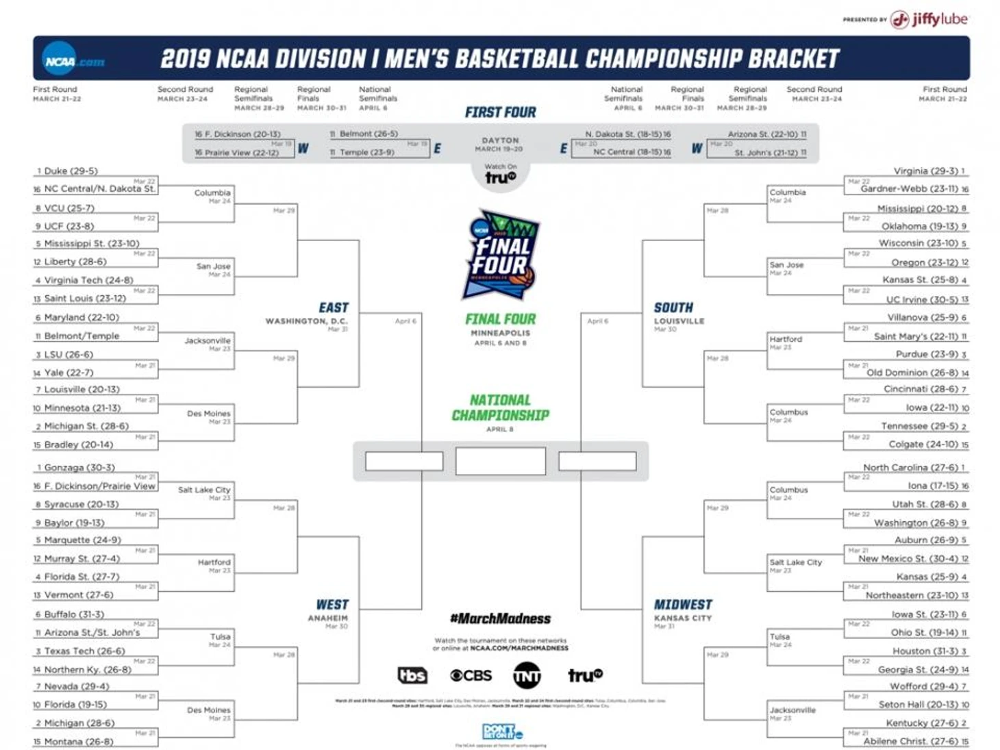 Матч между командами из (5) – (12) корзин обычно дает больше всего апсетов. В этом году я думаю, что именно (5) – (12) даст первый апсет: (12) «Мюррей Стэйт Рейсерс» обыграет (5) «Маркетте Голден Иглс». «Рейсерс» за весь год проиграли 4 матча, причем двое из них были против команд из SEC «Алабамы» и «Оберна». «Оберн» вообще стали чемпионом турнира SEC. К тому же против «Голден Иглс» будет играть консенсусный второй пик в предстоящем драфте Джа Морант. Также стоит отметить, что «Маркетте» проиграли 5 из последних 6 игр перед турниром.