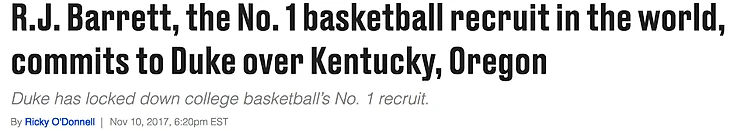 Статья SB Nation: Ар Джей Барретт, №1 баскетбольный рекрут в мире предпочел «Дьюк» «Кентукки» и «Орегону»