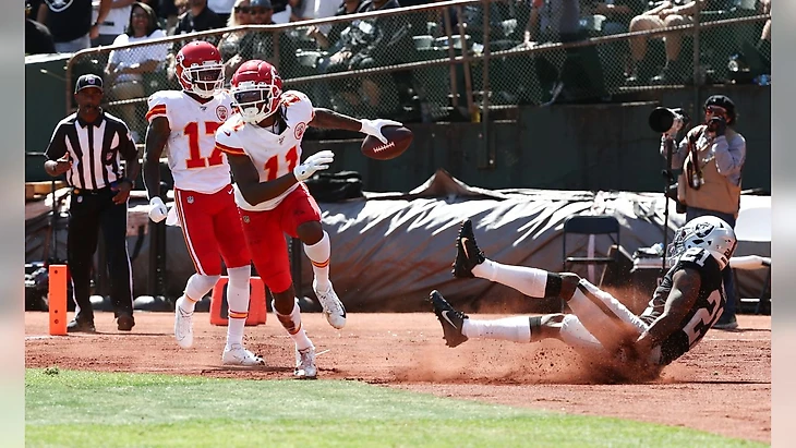 "Окленд Рейдерс"-"Канзас-Сити Чифс" 10:28.Квотербек гостей Патрик Махомс заработал 443 ярда и 4 тачдауна,ресивер Демаркус Робинсон имеет в активе 172 ярда и два занесённых тачдауна,тайт-энд Тревис Келче заработал 107 ярд и занёс один тачдаун.Квотербек хозяев Дерек Карр заработал 198 ярдов и один тачдаун,пропустил два перехвата."Вожди" выиграли первые две игры.