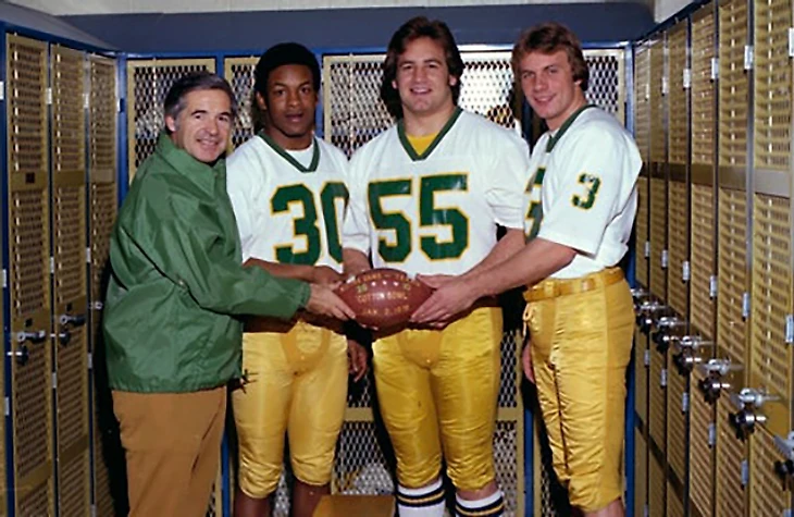 Дэн Девайн и три капитаны Нотр Дама 1978 года Джером Хивенс (30), Боб Голич (55) и Джо Монтана (3). Фото: Irish Illustrated