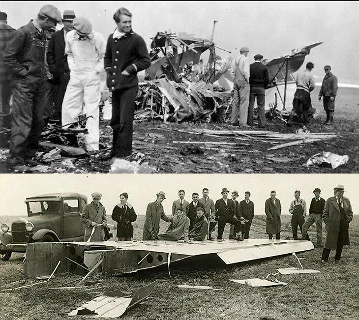 На месте крушения и гибели Кнута Рокне (сверху) и оторванное крыло Фоккер Ф-10 (внизу). Фото: Kansas Historical Society / Aircraft Accidents Archives