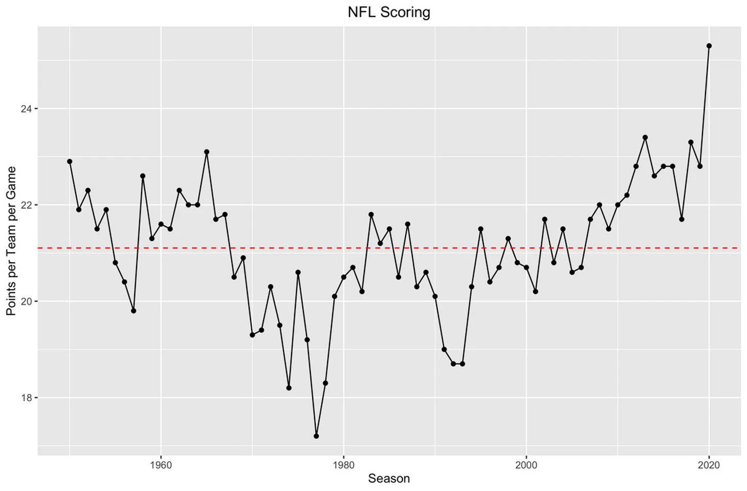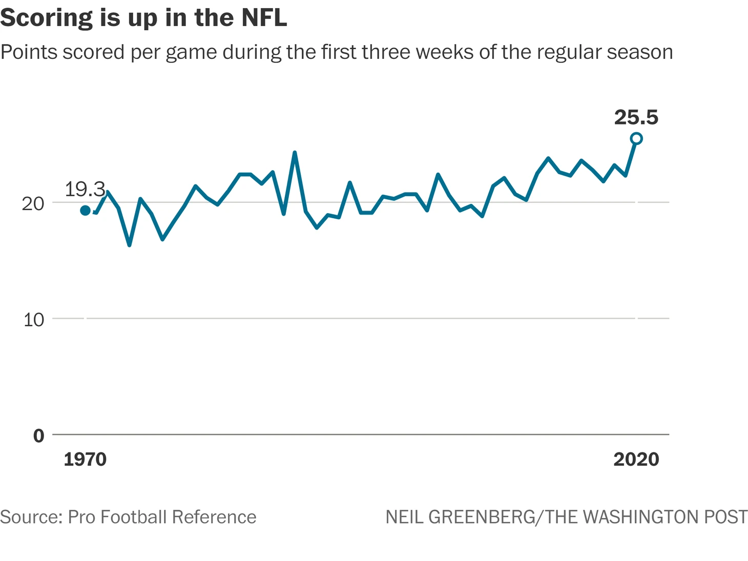 Еще одним следствием этого странного сезона стала его невероятная результативность, что тоже может быть объяснено ковидом, отсутствием предсезонки, от которой игроки защиты пострадали естественно больше. Хотя в целом тренд на рост количества тачдаунов и очков продолжается уже много-много лет, с начала нулевых – но никогда не было такого взрывного роста как в 2020 году. Этот год переписал абсолютно все рекорды по общей результативности команд за всю историю игры. Уже в первые три недели наметился бурный рост результативности, многие думали это просто начало сезона без предсезонки и защитники постепенно все же обретут нормальную форму и этот эффект пройдет.