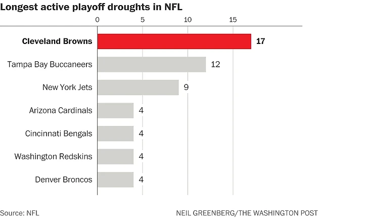 Кливленд вообще на протяжении десятилетий постоянно был всеобщим посмешищем, тут даже сложно найти аналогию в НБА или еще где – там даже Сакраменто, Миннесота или НЙ Никс гораздо более успешные и уважаемые команды чем футбольный Кливленд. Кливленд в последний раз выходил в плей офф в 2002 году – 18 лет назад, за эти 18 лет у них чего только не было – в том числе сезоны вроде 1-15 и 0-16, но никогда они даже не претендовали в общем на выход в плей офф, у них всего 1 сезон за это время когда не было отрицательного баланса побед и поражений. Это самая длинная серия без выхода в пост-сизон в истории НФЛ, при том что в 60е, 70 и 80е в плей-офф было выйти намного намного сложнее чем в 21-м веке.