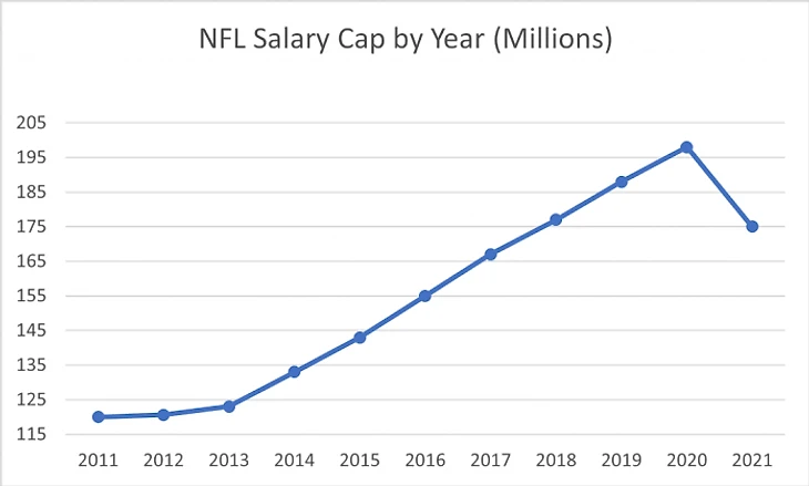 Есть, конечно, еще другие последствия – например экономические. На протяжении почти 30 лет с момента ввода в НФЛ потолка зарплат он постоянно рос, рос и рос, весьма быстро и стремительно – ни одна лига не богатела так быстро в этот период времени. В 1994 году он составлял 34 млн. долларов, а к 2020 вырос практически до 200 (плюс 40 млн на премии игрокам). Семикратный рост за 26 лет. В последние 10 лет он рос минимум на 10 млн в год, что позволяло менеджменту заключать все более дорогие и дорогие контракты со звездами на 3-4-5 лет со все большими и большими гарантированными выплатами.