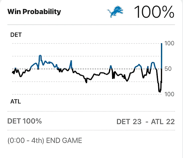 Атланта например проиграла Далласу ведя в счете 29-10 и 39-24 за 5 минут до конца при невероятных обстоятельствах, у них было 99.9% на победу (ну Атланта умеет проигрывать так красиво, они и супербоул недавно с 28-3 проиграли, где имели 99.7%).