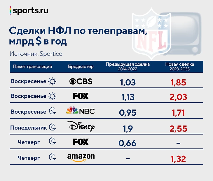 Теперь НФЛ будут показывать пять медиакомпаний: CBS, Fox, NBC, ESPN (принадлежит компании Disney) и Amazon.