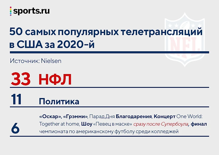В топе по просмотрам не только финал, а еще по 30 игр ежегодно. В 2020-м НФЛ вынесла даже политические шоу и трансляции дебатов. И это во время напряженных выборов президента.
