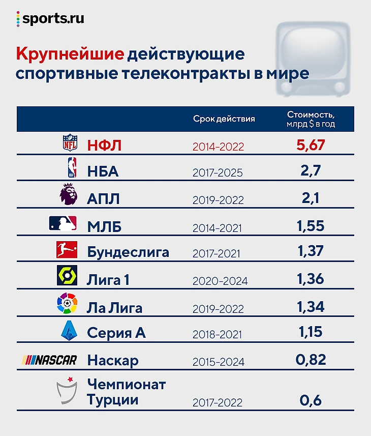 Казалось, что АПЛ – единственная неамериканская лига, которая может хотя бы приблизиться к медиадоходам спорта в США. С 2016-го по 2019-й телеконтракт приносил ей 1,7 млрд фунтов (2,35 млрд долларов), но с 2019-го – лишь 2,1 млрд долларов. И на второе место в мире вышел телеконтракт НБА на 2,7 млрд долларов.