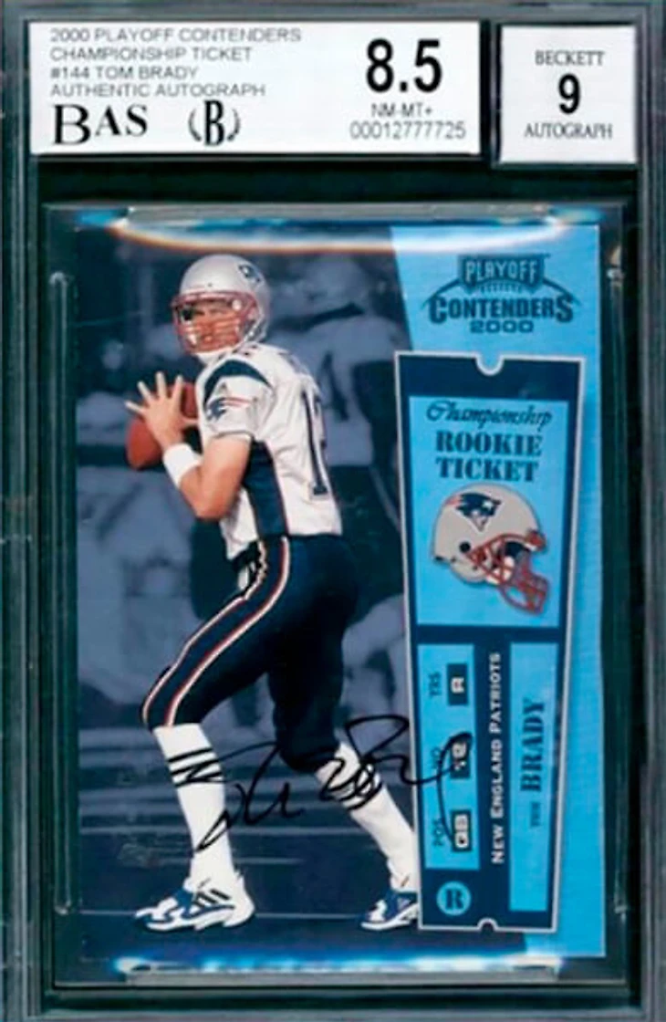 • Карточка с Брэди, которую выкупили на торгах аукционного Lelands, датирована 2000 годом. Это карточка новичка – тогда на драфте Национальной футбольной лиги (НФЛ) молодого Брэди забрали в «Нью-Ингленд Пэтриотс». Экземпляр уникален по двум причинам: он в идеальном состоянии, а еще на нем автограф Тома.