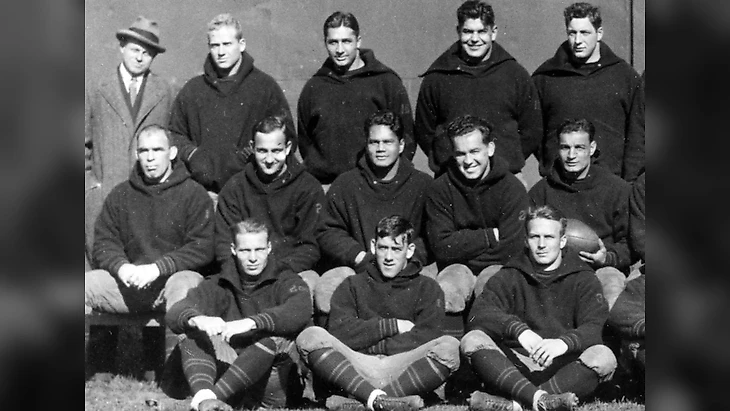 Добро пожаловать на 97 лет назад! Наш герой находится слева во втором ряду — на Олимпиаде в Париже он выиграл золото в лёгком весе, а затем семь лет профессионально играл в футбол в клубах с экзотическими названиями — «Провиденс Стим Роллер» и «Бостон Брейвс».