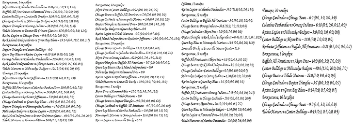 Как и в прошлые сезоны чёткого расписания у команд не было и они сами договаривались друг с другом о проведении матчей. Некоторые команды играли несколько раз друг с другом, не встречаясь с другими. По сравнению с прошлыми сезонами резко сдал Баффало. Начав с лёгких побед над аутсайдерами Хэммондом и Коламбусом, Баффало затем в 6 последующих матчах проиграл четырежды (включая домашний матч с Урангом) и 1 раз сыграл вничью. За высокие места команда не боролась. Удивила команда-новичок Толидо Мэрунс. В первых семи матчах команда победила пять раз и дважды сыграла вничью. Соперники были преимущественно не из сильнейших, аз исключением Кэнтон Буллдогс с которыми «Бордовые» сыграли 0-0 на выезде. К декабрю команда удерживала 100-процентный результат (напомню, что ничьи при подсчёте процента побед не учитывались). Действующие чемпионы, «Медведи» из Чикаго (сменившие прописку в межсезонье) были одним из фаворитом сезона и вели борьбу за чемпионство с соседями из «Кардиналс» и с «Бульдогами» из Кэнтона. 29 октября состоялась первая битва лидеров Чикаго Беарс уступили на своём поле Кэнтону 6-7. До этого матча Медведи шли без поражений и к концу ноября имели 8 побед в 9 матчах. Чикаго Кардиналс шли без поражений до 19 ноября (7 побед в 7 матчах), а потом к ним в гости приехал Кэнтон и победил 7-0. Через неделю команды встретились ещё раз, на этот раз в Кэнтоне. Бульдоги снова победили 20-3 и окончательно устранили одного конкурента. Второй конкурент Чикаго Беарс самоустранился дважды проиграв Кардиналс в матче на «первенство города» с одной стороны, за хорошее «призовое место» с другой. Беарс дважды проиграли всухую 0-6 и 0-9. Между этими матчами Кардиналс проиграли и свой третий матч в сезоне – крепкому Дэйтону и не смогли занять даже второе место, несмотря на две победы над «серебряным призёром». Чемпионом могли бы стать футболисты из Толидо, для этого им нужно было выиграть последние две игры сезоны в Чикаго с Медведями и дома с Кэнтоном. Толидо проиграло обе игры: 0-22 и 0-19 соответственно и по проценту побед в сыгранных матчах опустились на 4 место. Чемпионами заслуженно стали Кэнтон Булдогс во главе с играющим тренером Гаем «Чемпом» Чемберленом и звездными тэклами Линком Лайманом и Питом Хенри, обыгравшие всех конкурентов. Они одержали 10 побед и 2 ничьи в 12 матчах. Чикагские коллективы попали в тройку.Полностью календарь на сезон выглядел так:Ну и как всегда в конце приблизительные формы в которых команды играли в том сезоне (какие удалось найти):