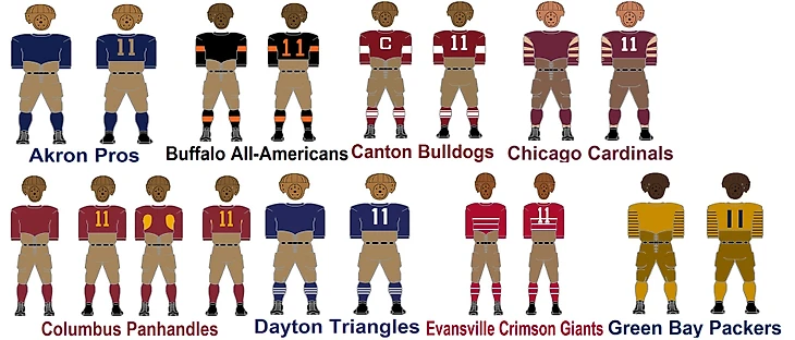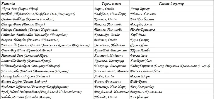 Чикаго Стэйлиз переименовались в Чикаго Беарс, Расин Кардиналс – в Чикаго Кардиналс (наконец-то) Новыми командами присоединившимися к лиге были Милуоки Бэджерс, Толидо Мэрунс, Расин Лиджен (на этот раз правда команда из города Расин, Висконсин) и Уранг Индиенс. Последние полностью состояли из коренных жителей америки – индейцев, а тренировал команду легендарный Джим Торп, который считался величайшим спортсменом своего времени. Полный список команд-участниц выглядел так:Торп родился в 1888 году на территории современного штата Оклахома. Его отец был ирландец, а мать наполовину француженка, наполовину индианка. Его индейское имя было Светлый Путь. У него было сложное детство, его брат-близнец умер в возрасте 8 лет, а мать умерла, когда Джиму было 14. Учиться молодой Торп не любил и часто прогуливал школу. Его отец отчаялся воспитать сына и в 1904 году отправил его в государственную индейскую школу в Пенсильвании. Там-то он и показал свои навыки спортсмена. Как-то он побывал на тренировке легкоатлетов и увидел как спортсмены имеют проблемы с прыжком в длину. Торп, одетый в повседневную одежду с первой попытки взял высоту в 173 сантиметра. Легендарный тренер Поп Уорнер взял Джима под своё крыло и тренировал его как легкоатлета. Торп регулярно участвовал в соревнованиях , участвовал в 7-8 видах программы и регулярно побеждал в 6. Вскоре он стал заниматься футболом. Торп стал знаменитым в 1911 году когда играя как раннинг бэк, дифенсив бэк, киккер и пантер он набрал все очки своей команды в игре против очень сильной команды Гарварда. Торп успешно выступал в футболе, бейсболе, лакроссе и даже выиграл в 1912 году национальный чемпионат по бальным танцам. В 1912 году его команда индейского колледжа Карлайла выиграла национальное чемпионство. Торп занёс 25 тачдаунов и набрал 198 очков. В том сезоне он сыграл в игре против будущего президента США Дуайта Эйзенхауэра и занёс 97-ярдовый тачдаун. Игра произвела огромное впечатление на Эйзенхауэра, что в своей речи 1961 года он сказал: «Одаренных людей много, таких как Джим Торп он не знает. Ему не нужно было тренироваться, но он был лучшим на всех позициях, на которых играл». Он был признан лучшим игроком в 1911 и 1912 годах. Кроме футбола и легкой атлетики Торп отлично себя показывал в бейсболе, лакроссе, баскетболе, гольфе, плавании, бильярде, гребле, хоккее и боксе. В 1919 году он стал профессиональным игроком в футбол и бейсбол. В 1919 году он отбивал мяч в 33% подач. В 1912 году он представлял США на летней олимпиаде в Стокгольме, доминируя в пятиборье и десятиборье. В пятиборье он выиграл 4 из 5 видов программы: прыжок в длину, бег на 200 и 1500 метров и метание диска и был третьим в метании копья. В десятиборье он установил рекорд в беге на 1500 метров и с 8412 очками он побил мировой рекорд на 998 очков. Король Швеции Густав V был так впечатлён, что вручая очередную золотую медаль Торпу сказал: «Сэр, вы самый великий спортсмен в мире». По возвращение в Штаты он получил большие почести, был проведён целый парад в его честь. Торп говорил: «Я слышал как люди кричали моё имя, Не могу себе представить, что у одного человека может быть так много друзей». Президент даже назвал его великим американским гражданином, в этом была доля иронии, т.к. из-за своего происхождения и места рождения (индейская территория, которая не была тогда частью США), он не счи