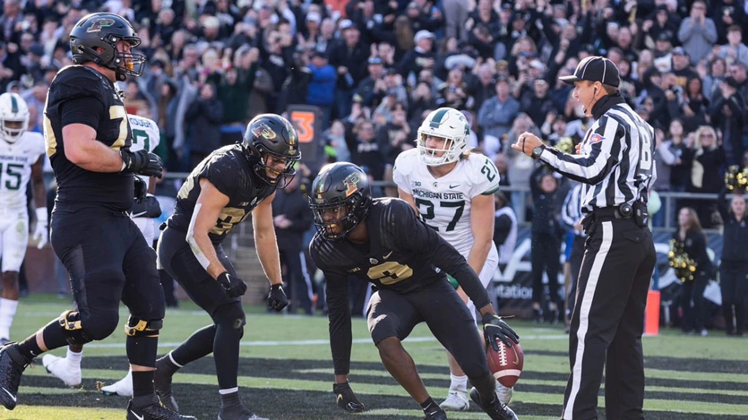 В первую ноябрьскую субботу Мичиган Стейт приехали в Уэст Лафайетт и сразу столкнулись с трудностями -- 7-7 по итогам первой четверти. Но во второй четверти хозяева полностью превзошли Мичиган Стейт, одним из ключевых моментов матча стал хитрый ход тренера Пердью Джеффа Брома, подопечные которого разыграли комбинацию с несколькими передачами и завершившуюся пасом Эйдена О'Коннелла на Джексона Антропа. Такие комбинации Бром использует в игре своей команды регулярно и по его признанию конкретно эту он подсмотрел на Ютубе в игре школьных команд год назад. Этот тачдаун сделал счёт 21-7 и пас стал третим на тачдаун от квотербека Бойлмейкеров, что является повторением лучшего для него результата, а всего лидер команды из Индианы набрал аж 536 ярдов паса. Рекордной эта игра стала и для Дэвида Белла (его тачдаун выше), который принял 217 ярдов паса, это его 15 игра с более чем 100 ярдами приёма, больше чем у любого игрока Пердью в истории. У Джона Стэндефорда, выигравшего Супербоул XLI в составе Кольтс, было 14.