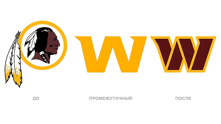 Клуб НФЛ (NFL) на волне борьбы с расизмом в США в очередной раз поменял свое название. Ранее, в 2020-м, «Вашингтон Редскинз» (Washington Redskins) убрали слово «Редскинс», а накануне обнародовали новое имя — «Вашингтон Коммандерс» (Washington Commanders). Процесс ребрендинга также коснулся эмблемы команды. После, более чем полуторагодовалого промежуточного логотипа, был показан обновленный значок. Он представляет собой стилизованную бордовую литеру «W» с золотым контуром.