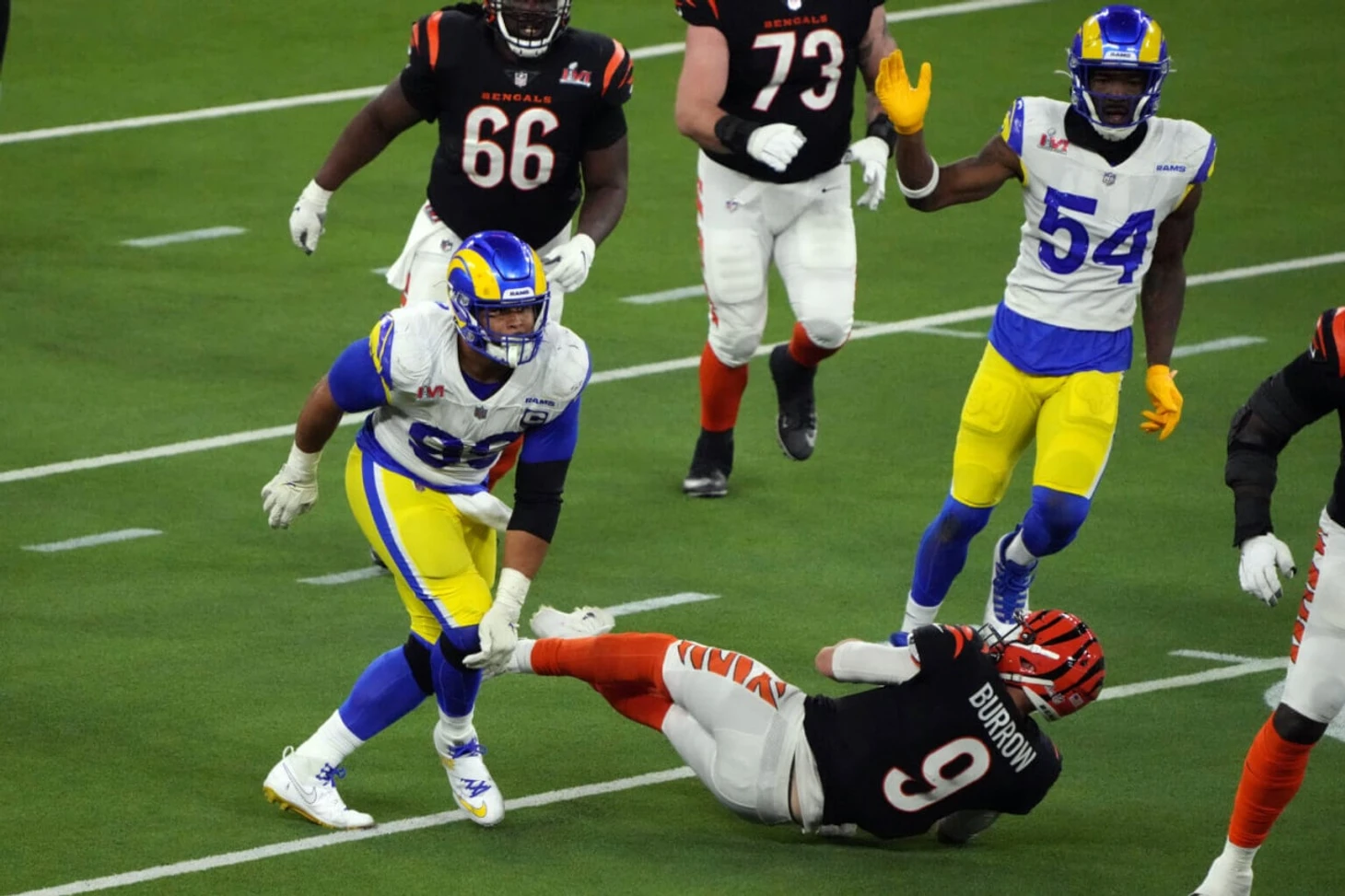 Для Лос-Анджелес Рэмс этот финал закончился так как надо: Аарон Дональд повалил Джо Барроу за землю, тот делает неверную передачу, а защитник срывает с себя шлем в честь победы в СуперБоуле и выразительно указывает на свой безымянный палец.