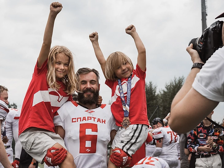 Это два брата Костя (9 лет) и Илюша (7 лет), они знают, что такое «слэнт», «хитч» и «ап» (*название маршрутов для принимающих), а все потому что их папа играет в нашей взрослой команде «Спартак» и они уже давно знакомы с американским футболом. Мы сделали исключение для Ильи и взяли его в секцию в столь раннем возрасте, но только потому, что у него уже есть база и знание основ благодаря Ивану (отец ребят), ну и не разделять же братьев. Тем более в этом году ему уже исполнится 8 лет.