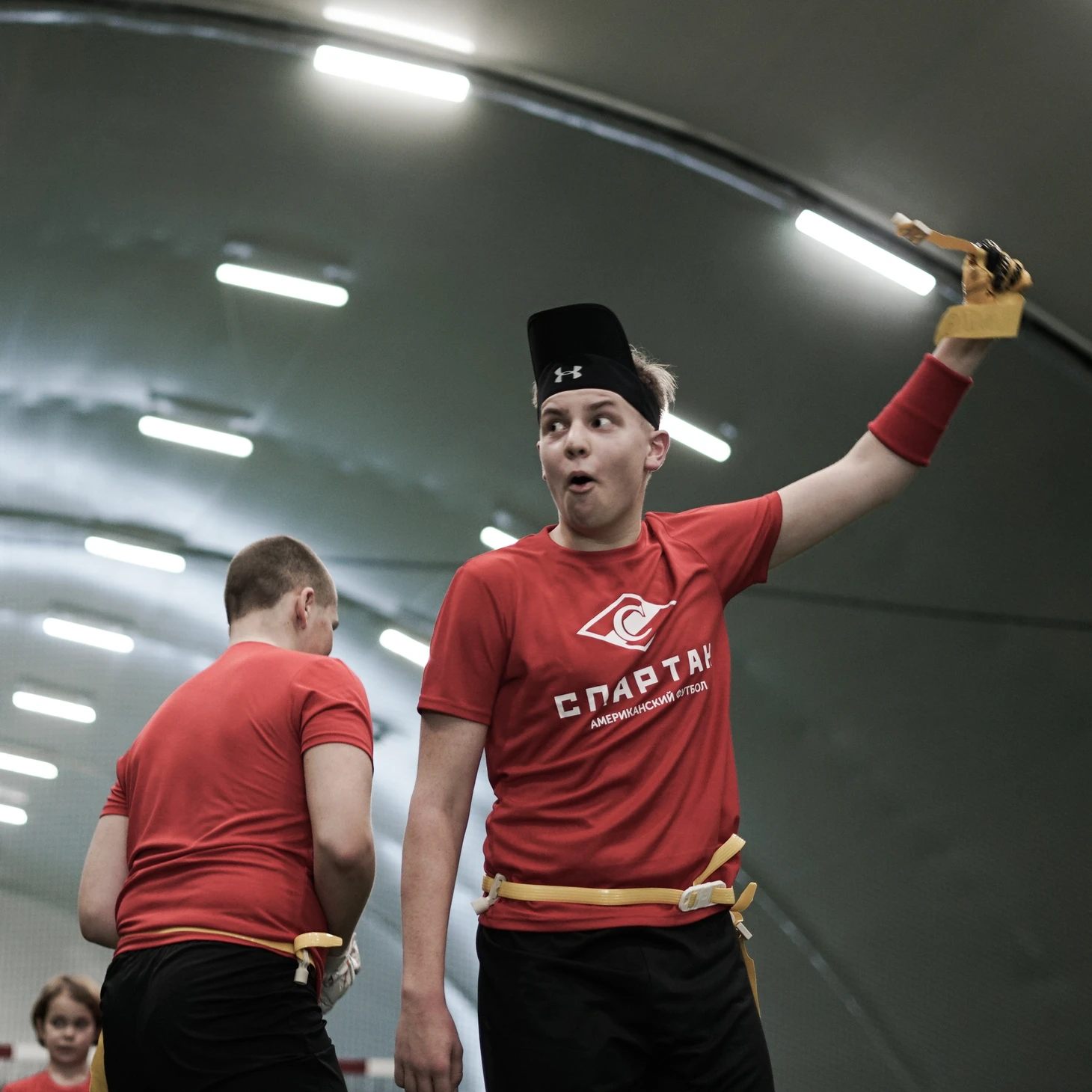 Сейчас это происходит с помощью флаг-футбола (бесконтактная версия американского футбола). Нам важно, чтобы дети поняли суть игры, а уже с мая месяца как выйдем тренироваться на улицу на открытое поле, то начнем потихоньку вводить тренировки в шлемах и каркасах. Будем захватывать подушки, учиться падать, группироваться и привыкать к «броне» : )