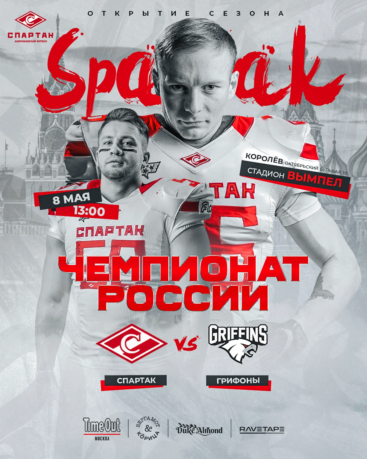 «Спартак» vs «Грифоны»; 8 мая, 13:00; г.Королев, Октябрьский бульвар 10, стадион «Вымпел»; Важно знать: вход на игру свободный. Помимо игры вас ждёт яркое выступление Red Fox Show&Cheer Dance.