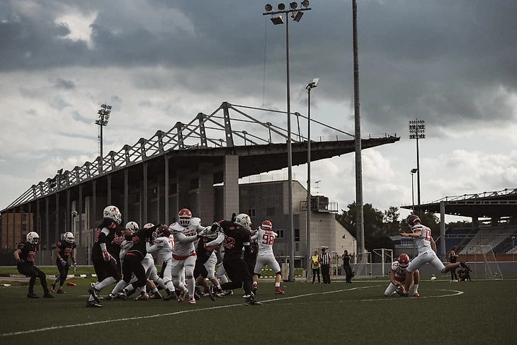 Мы уделяем много внимания тренировочному процессу в разных аспектах. Также проходят тренировочные сборы, скримиджи (игровая тренировка с другой командой) и обязательно товарищеские игры перед сезоном. Обязательно делают теоретические занятия. У нас есть домашний стадион «Вымпел» в Королеве, который разрешает нам сделать разметку с ярдами как на настоящем поле для американского футбола и поставить ворота «рогатки». Штат игроков – в общем в команде около 70 человек, в ростер попадает 55 игроков, на игру допускается 45.