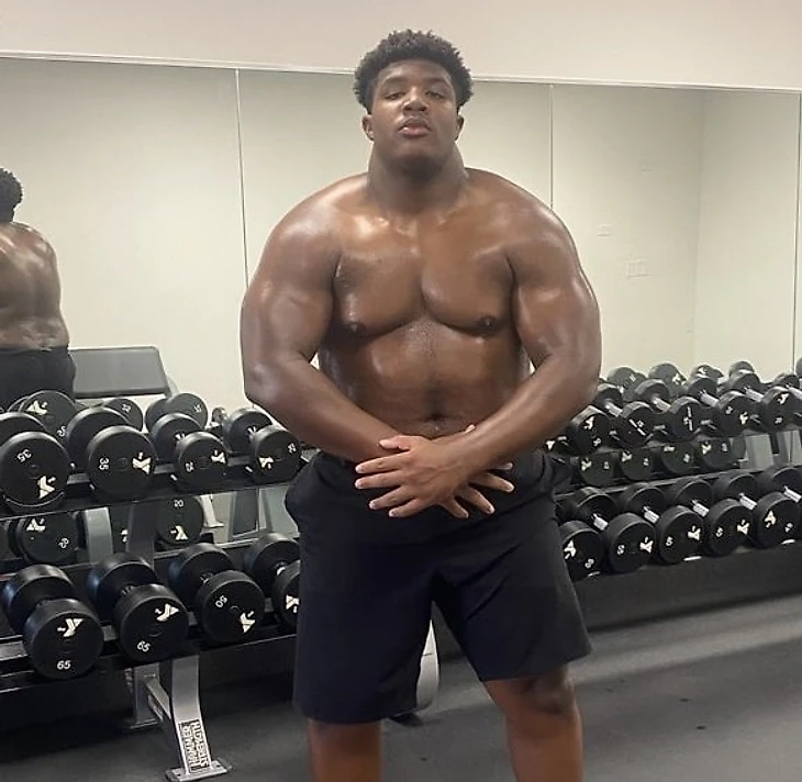 Это Тайлер Паркер. Он играет на позиции ди-лайнмена в старшей школе Святой Маргариты (Калифорния). Его вес 137 килограмм, рост 185 см. И ему 14 лет.