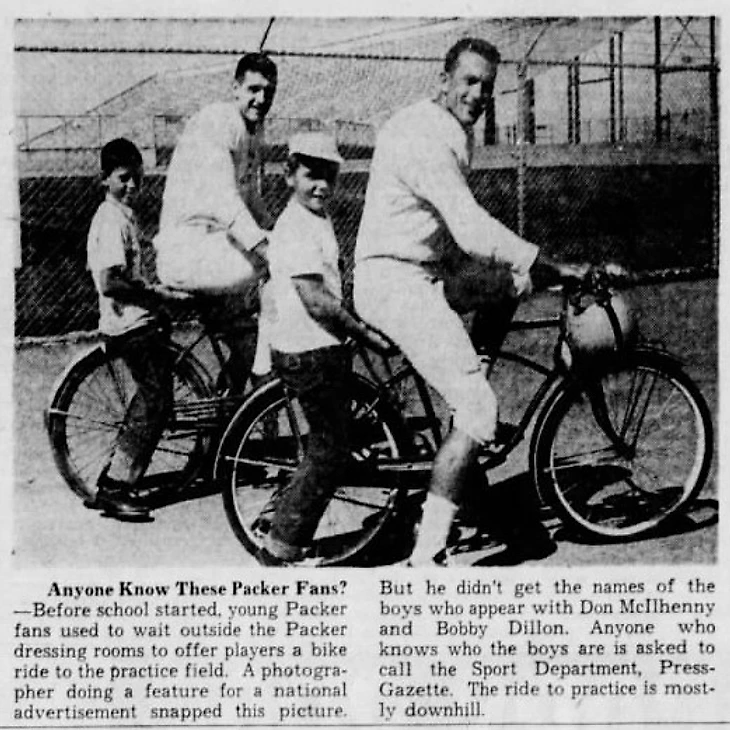 Фотографию сопровождала пространная подпись: «Кто-нибудь знает этих фанатов Пэкерз? Перед началом школы юные фанаты обычно ждали у раздевалок Упаковщиков, чтобы предложить игрокам прокатиться на велосипеде до тренировочного поля. Этот снимок сделал фотограф, работавший над репортажем для национальной рекламы. Но он не узнал имён мальчиков, которые появляются с Доном Макилхенни и Бобби Диллоном. Всех, кто знает, кто эти мальчики, просят позвонить в отдел спорта Пресс-Газетт. Поездка на тренировку в основном идёт под гору.».