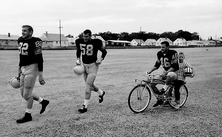 На фото корнербэк Пэкерз Хэнк Греммингер (46) едет на велосипеде с неизвестным мальчиком за спиной, в то время как ди-энд Джим Темп (82) и лайнбэкер Дэн Карри (58) идут впереди велосипеда к тренировочному полю.