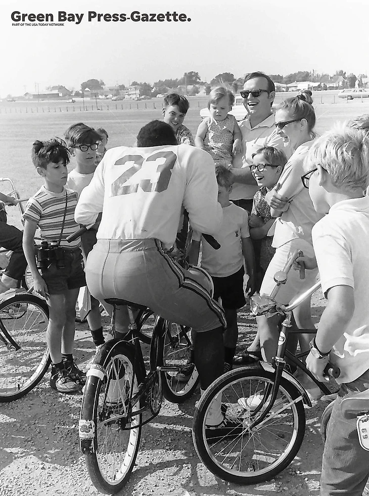 Буквально несколько дней назад Саманта Мадар, которая работает над проектом по оцифровке плёночных фотографий Упаковщиков 1940–1990-х годов из архива Грин Бэй Пресс-Газетт, опубликовала в твиттере ещё одно фото, на котором Трэвис Уильямс сидя на велосипеде, разговаривает с детьми и болельщиками Пэкерз.