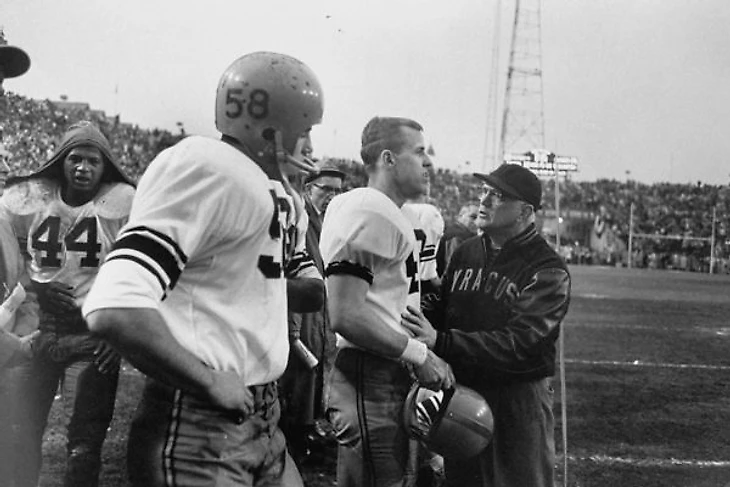 В «Сиракьюз» во время скримиджей первый состав играл против третьего, а второй - против четвёртого. Поэтому когда скримидж возобновился, я вышел против первой команды. Я продолжил отлично играть, мне даже пару раз удалось захватить за линией розыгрыша наших основных хавбеков - Эрни Дэвиса и Марка Уэбера. Во время одного из розыгрышей Дэвис приблизился к линии как раз в тот момент, когда я прорвался через блок. Увидел меня в проходе, он начал двигаться вдоль линии, тогда я догнал его и захватил со спины.
